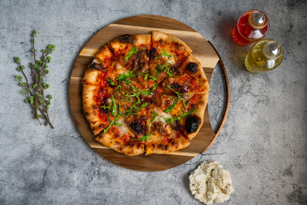 Calabrese nduja, caramelised onions, buffalo mozzarella, Italian herbs, rocket