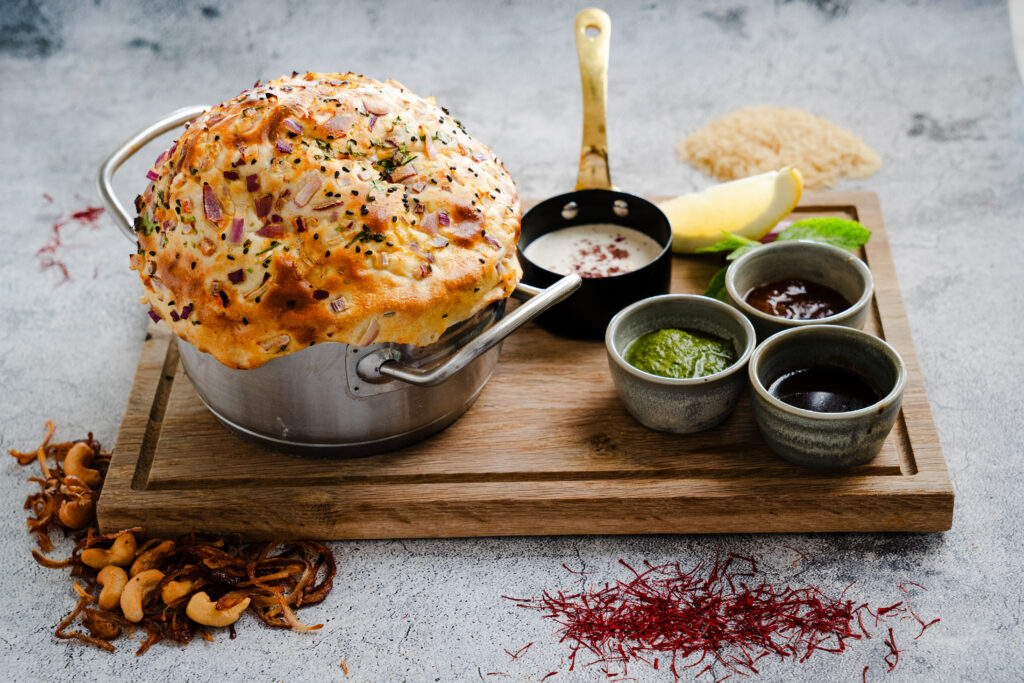cut open to serve the biryani, releasing the spice aromas. Served with sumac yoghurt.