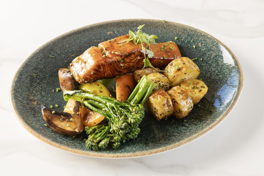 Salmon steak glazed with a sweet and savoury soy-based flavour served with steamed vegetables and roasted potatoes.